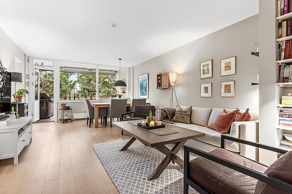 Stuen har store vindusflater som gir rikelig med dagslys og en behagelig atmosfære.