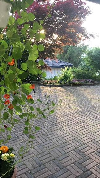 Liten sitteplass på 10 m2 utenfor inngangen. Parkering for 2 biler utenfor leiligheten.