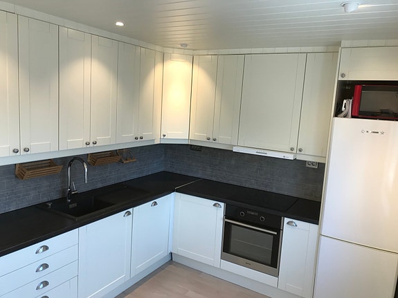 Kjøkkenet er helt nytt, og det følger med mikroovn og ovn. Oppvarming av bolig kan gjøres med varmepumpe og gjennom peisen.
