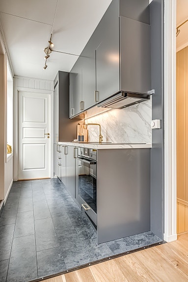 Leiligheten fremstår meget delikat med moderne kjøkkeninnredning.