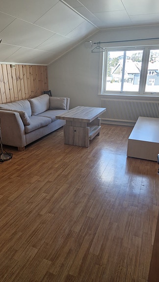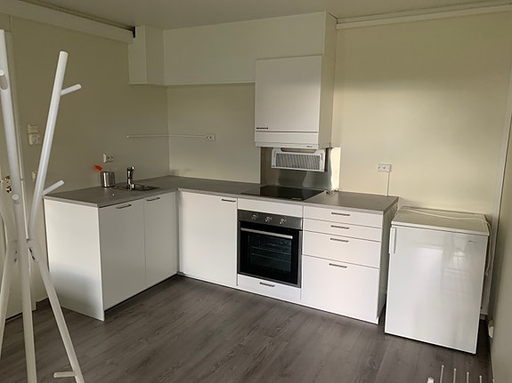 Egen inngang. Åpen løsning med kjøkken og stue, vedovn og varmepumpe installert. 1 soverom med garderobeskap, og romslig bad. Umøblert, men inkludert hvitevarer (kombiskap, oppvaskmaskin, komfyr og vaskemaskin).