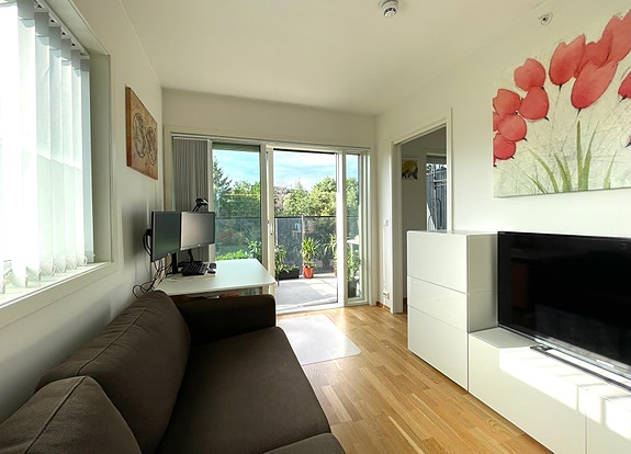 FORNEBU-Lys 2-roms leil. i 4. etg, vestvendt balkong. møblert, inkl. internett, varmt vann, fjernvarme. Ledig 01. okt.