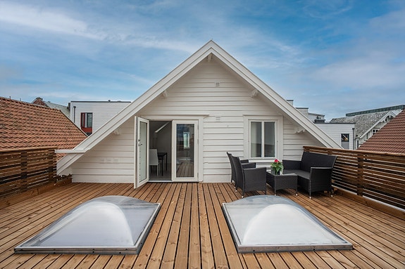 Loft: Stue/kjøkken, soverom, gang, bod, bad/vaskerom, flere kott og stor takterrasse.