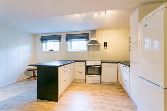 Delvis møblert med sofa, bord, komfyr, kjøleskap m/fryser.