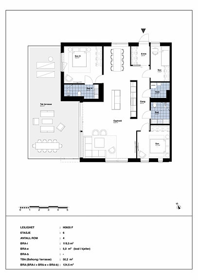Primærrom: 119,60 kvm, Bruksareal: 124,50 kvm, BRA-i: 119,50 kvm , BRA-e: 5 kvm , TBA: 50,20 kvm