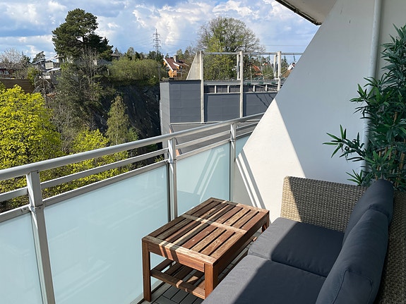 Leiligheten har en balkong med sofa, bord og puter, med utsikt over Oslofjorden til venstre og nordvestvendt beliggenhet som gir mye kveldssol.