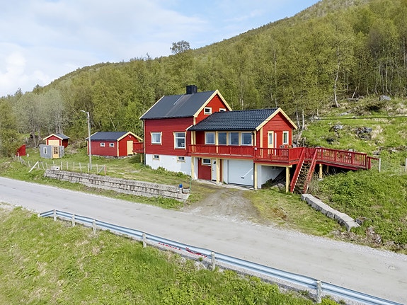 På eiendommen finner vi også drivhus, vedsjå og 2 uthus. Bolighuset er oppført i 1949 og påbygd og renovert i 2005 med integrert