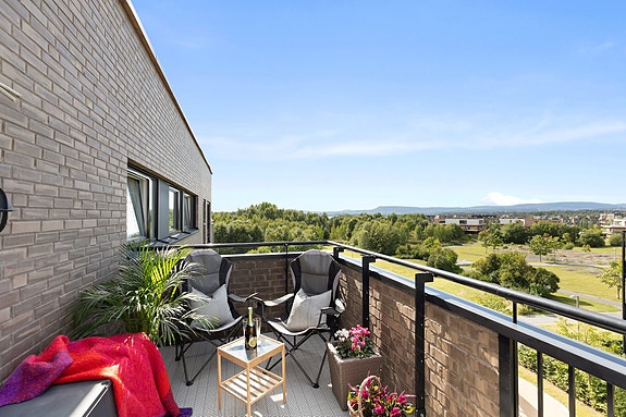 Luksuriøs balkong: Den solfylte balkongen gir en luftig følelse og fantastisk utsikt. Det er det perfekte stedet å nyte morgenkaffen eller slappe av med en fantastisk solnedgang etter en lang dag.