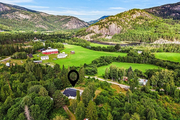 Eneboligen ligger usjenert til i skogsterreng, fra boligen har man fint utsyn og en romslig tomt.