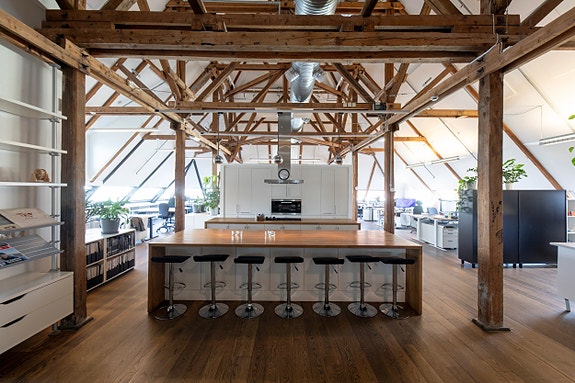 Lokalene ligger i byggets 5. etasje og fremstår som et unikt kontorlokale. Dette er toppetasjen i bygget og lokalet har originale bjelker i taket og en takhøyde på hele 10 meter på det høyeste. Her er det flere innredningsdetaljer som gjør inntrykk. Hvite vegger, synlige originale bjelker og gulv i heltre oljet eik.