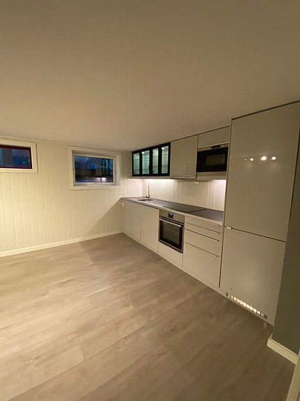 Hvitevarer (kjøleskap/frys, oppvaskmaskin og induksjonsovn) er tilgjengelig for bruk. Oppkobling til vaskemaskin på baderommet. Eget inngangsparti. NB: Disponerer ikke parkeringsplass for bil.