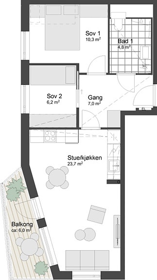 Leilighet med to soverom med generøs takhøyde, store vindusflater og lys en-stavs eikeparkett. Som kjøper kan du velge kostnadsfritt mellom tre ulike interiørstiler: fargepalett til veggene, kjøkkenfronter/benkeplater og innredning på bad. Ny teknisk standard og balansert ventilasjon sørger for godt inneklima og lave kostnader til oppvarming.