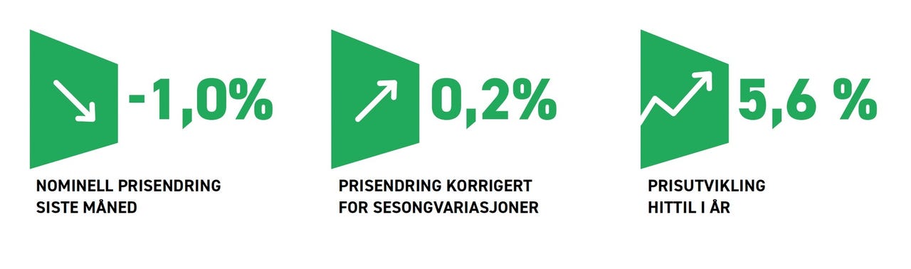 Kvadratmeterpris tilsvarer prisantydning pluss fellesgjeld per kvadratmeter (p-rom eller BRA-i). Prisene i grafen er avrundet til nærmeste 1000 kr.