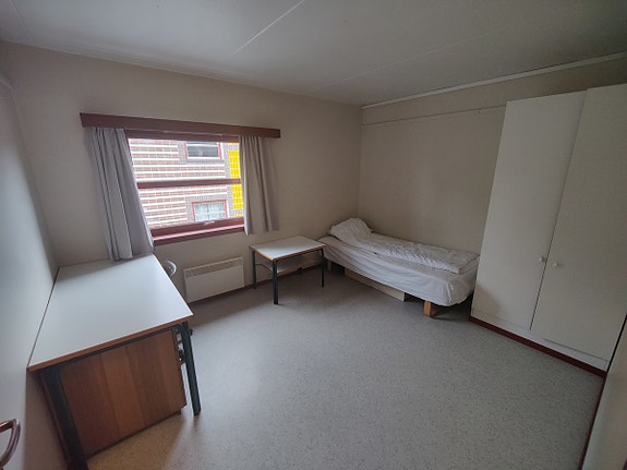 Alle rom er fullt møblert med seng, garderobeskap, skrivebord og stol.