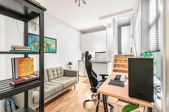 Leiligheten er arealeffektiv og har et helt nytt kjøkken med platetopp, stekeovn, kjøleskap med fryser. Plassbygd seng med god oppbevaringsmuligheter. Plass til liten sofa eller spisebord med stoler. Baderom med varmekabler, ny rain shower dusj og servant. Romslig entré med garderobeskap og med plass til et kontorhjørne. Flott balkong med plass til bord og stoler. Leiligheten og balkongen vender mot rolig bakgate.