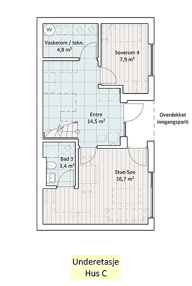 Entre, vaskerom/ teknisk rom, soverom, stue/ alternativt soverom og bad.