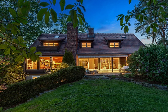 You arrive at the home in a bright and inviting entrance hall. From the entrance you enter the living room, which feels large and airy and has very good natural light from the large window surfaces. Here there is plenty of space for a larger dining table with room for family and friends. The fireplace in the dining room warms well in winter and gives a nice atmosphere to the room. There is also direct access via large sliding doors to the home's green outdoor areas. The property has a very spacious garden, with impeccable sunny conditions and nicely cultivated green areas. There is a terrace both in front and at the back of the house, which provides good opportunities for use. There is also a great outdoor fireplace on the terrace in the garden.
