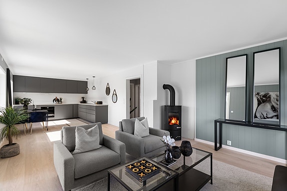 Tomannsboligen er horisontaldelt, og denne seksjonen ligger i 1. etasje. Her er det en åpen stue- og kjøkkenløsning, to soverom og et flislagt bad. Videre ned i kjelleren er det en lys og pen kjellerstue og et romslig bad/vaskerom. Et stort kjellerrom med egen utgang er i byggetegningene definert som hybel og bod. Fra stuen er det utgang til sørvendt og overbygget terrasse med videre adkomst til felles hage. Her er det bare å flytte rett inn!