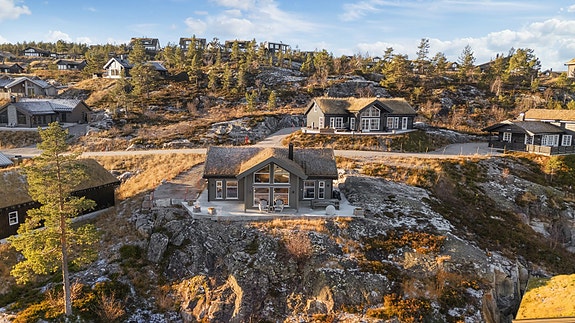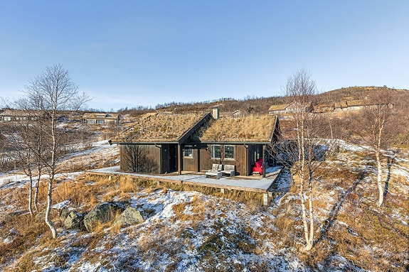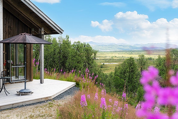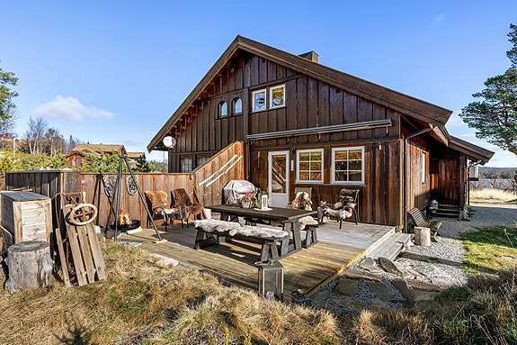 Særdeles smakfullt innredet hytte. Herlige uteplasser, flott utsikt og svært gode solforhold!