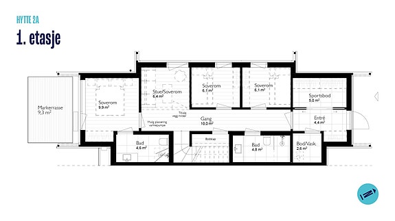 Eksklusiv fjellhytte med 3 soverom (5 mulig), 2 bad, vaskerom, 2 stuer, åpen kjøkkenløsning, terrasse, 2 balkonger, sportsbod, generøse vindusflater og god takhøyde.