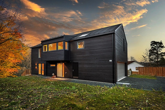 Arkitekttegnet enebolig med med solrik og barnevennlig beliggenhet. Boligen har en luftig planløsning i halv-etasjer og store vindusflater som slipper inn godt med naturlig lys. Rundt boligen er det flere hyggelige sitteplasser, fra stuen er det utgang til stor, delvis overbygget terrasse og fra kjøkkenet er det utgang til overbygget terrasse med trapp opp til stor, solrik terrasse over garasjen. Boligen går over fire halvetasjer og inneholder tre soverom + kontor/soverom, bad, toalettrom, vaskerom, kjellerstue samt stue og kjøkken i åpen løsning. I tillegg er det garasje og biloppstillingsplass i egen gårdsplass.