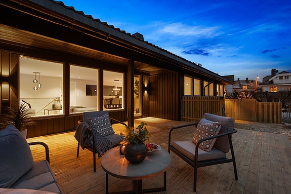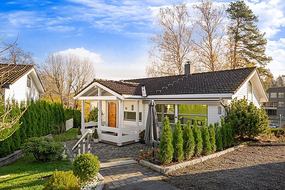 Boligen preges av store vindusflater og en åpen, luftig planløsning. Stuen har direkte utgang til en skjermet terrasse og en solrik, barnevennlig hage som omkranser huset.