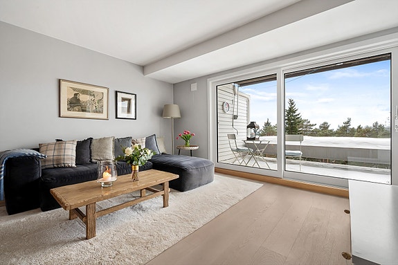 Med beliggenhet på bakkeplan får du sømløs tilgang til plenen og den fredelige skogen rett utenfor døren. Markterrassen er på hele 20 m2.