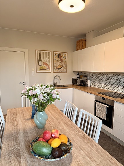 Kjøkkenet er utstyrt med oppvaskmaskin, platetopp (induksjon), komfyr og kjøleskap. Opplegg for vaskemaskin på badet.