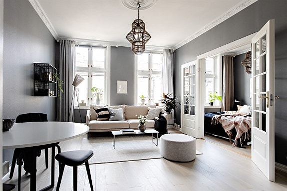 Her får du en kombinasjon av historiske detaljer og moderne komfort: stukkatur, lysekrone, høye tak og store vinduer – samtidig som det er høy standard og innredet med kvalitetsmøbler.