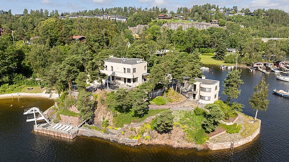 dobbel garasje med egen leilighet over (kjøkken, stue, bad, soverom), flere terrasser og uteplasser, bod/lagringsrom