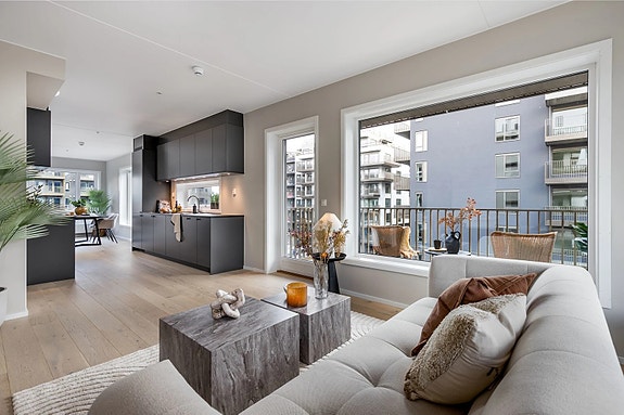 • Åpen og lys stue- og kjøkkenløsning med store vindusflater og godt lysinnslipp
