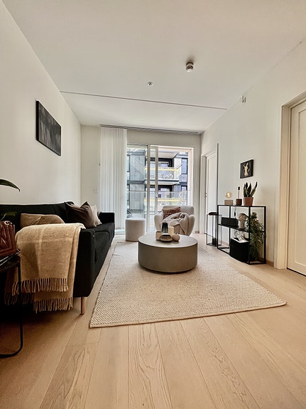 Moderne og funksjonell planløsning med åpen stue/kjøkkenløsning som gir optimal plassutnyttelse. Kjøkkenet er fullt utstyrt med integrerte AEG-hvitevarer inkludert kombiskap, komfyr med induksjonstopp, oppvaskmaskin og ventilator. Badet har vegghengt toalett, dusjløsning og mulighet for vaskemaskin og tørketrommel. Boligen leveres umøblert.