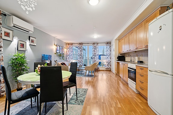 Her bor du i et populært og barnevennlig boligområde, samtidig som du har kort vei til sentrum, UiT, UNN og Jekta. Leiligheten har en god planløsning med lyse flater og store vinduer. Du får 3 soverom, lekkert bad, praktisk vaskerom, og et allrom med ekstra takhøyde som kombinerer stue, spiseplass og kjøkken. Uteområdet gir deg muligheten til å nyte fine dager på balkongen i 2.etasje, den skjermede markterrassen i hagen og på plattingen ved inngangen. Parkering og sportsbod i garasje.