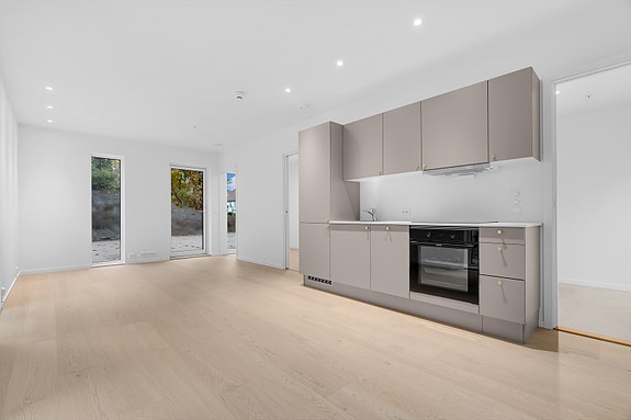 Bud Ønskes - flott 3-roms + alkove med utsikt, sol og to bad. Meget stor uteplass og en spennende planløsning. Garasje.