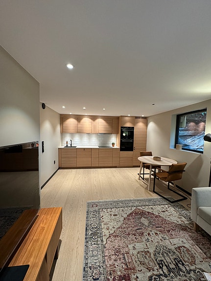 Kjøkken: Kjøkken med lys innredning, godt med skap- og benkeplass. Hvitevarer er ikke inkludert.