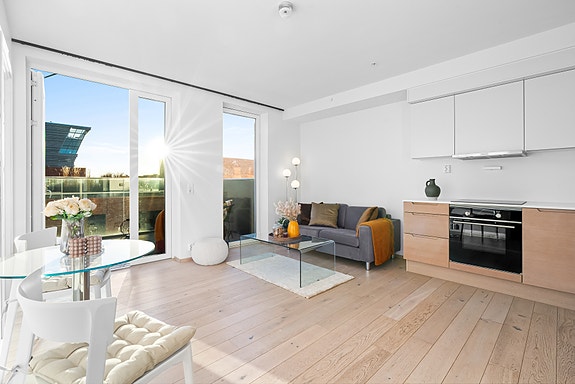 Leiligheten ligger i et nybygg med høy standard og fremstår som lys, luftig og svært innbydende. Den åpne stue- og kjøkkenløsningen skaper en sosial og funksjonell atmosfære, hvor store vindusflater sørger for rikelig lysinnslipp gjennom dagen. Kjøkkenet har integrerte hvitevarer og et moderne uttrykk, og fra stuen har du direkte utgang til en hyggelig balkong – et perfekt sted for morgenkaffen eller rolige kvelder i frisk luft.