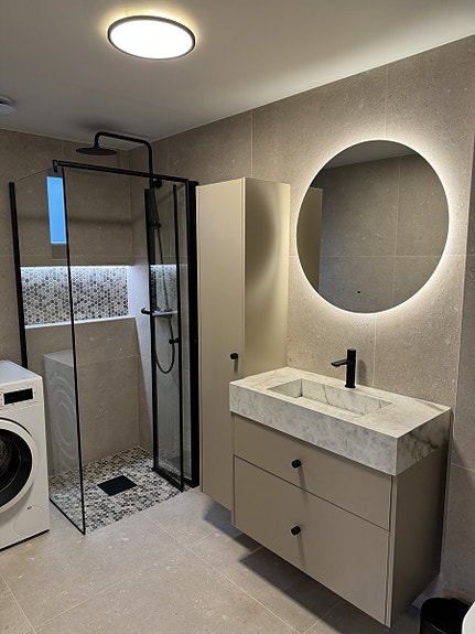 - Moderne bad med lyse fliser på gulv og vegger. Dusj, servant og vegghengt toalett. Vaskemaskin. Varmekabler.