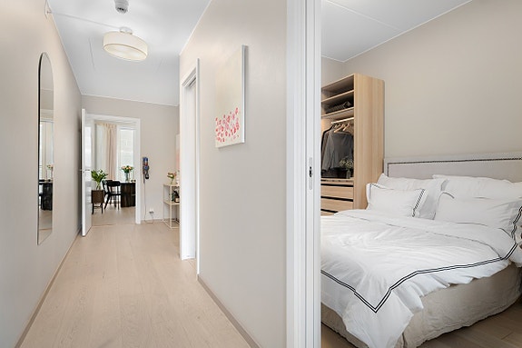 Leiligheten ligger i byggets tredje etasje, med heisadkomst opp til etasjen. Entréen gir et svært godt førsteinntrykk og setter tonen for resten av boligen. Her møtes man av en lys og praktisk gang med god plass til oppheng av yttertøy. Gulvet er belagt med flott én-stavs eikeparkett, og i himlingen er det downlights som gir behagelig belysning. På veggen finnes tablå med døråpner og videoporttelefon. Fra entréen er det også tilgang til en innvendig bod på ca. 2,7 m² som er innredet for praktisk oppbevaring.