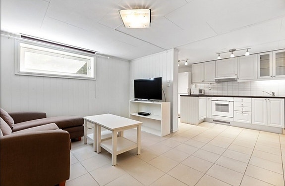 Sofa, TV-benk, lite spisebord med stoler, seng og hvitevarer (vaskemaskin, kjøleskap og komfyr)