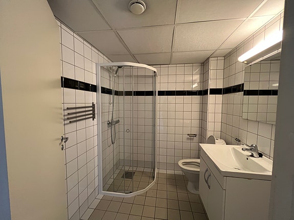 Delikat baderom som er flislagt. Det er varmekabler i gulvet. Dusjhjørne, servant med speil over, vegghengt toalett. Vaskmaskin medfølger.