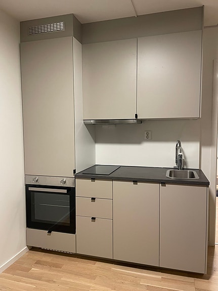 Kjøkkenet er smart integrert i rommet, med mørke fronter og laminat benkeplate. Her finner du stekeovn, platetopp og kjøleskap, og her finner du skap- og benkeplass. Det er ikke opplegg for oppvaskmaskin.