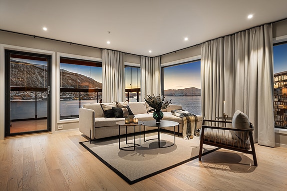 Vi leier ut vår helt nye 4-romsleilighet på Nyholmen i Tromsø. Leiligheten ligger så nær sjøen du kan komme og bare 10 minutters gange fra sentrum. Den har en fantastisk utsikt, høy standard og er i et bo-område uten biltrafikk. Leiligheten er på 124 kvm som inkluderer en romslig innglasset veranda. Tre soverom og to bad. Bod både i leilighet og i kjeller. I fellesarealene har du tilgang til badstu, treningsrom, selskapslokale og sykkelparkering. Egen parkeringsplass ute under tak like ved.
