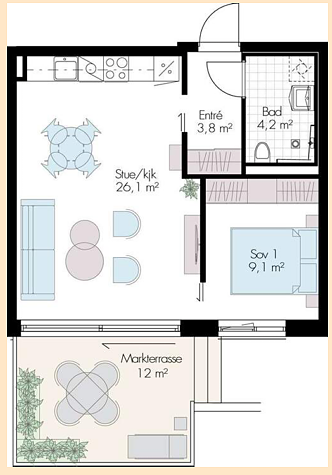Entre, flislagt bad med dusjhjørne og vaskemaskin medfølger. Åpen kjøkkenløsning med integrerte hvitevarer. Soverom med god størrelse og garderobeskap.