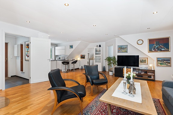 Eiendomsmegler 1 har gleden av å presentere denne endeleiligheten som befinner seg i 2. etasje. Inne finner vi en lys og romslig stue med peisovn. Foto v/Morten Fasseland.