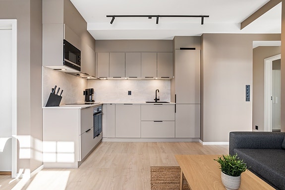 Leiligheten fremstår som lys og fin og innehar en normalt god standard med hensyn til materialvalg, utrustning og utførelse.