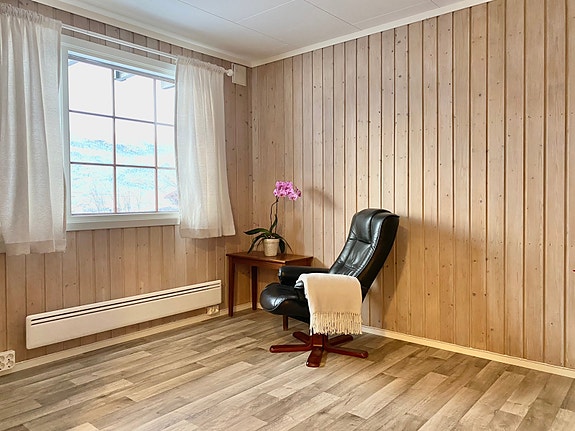 Pene hvitmalte vegger samt eik laminatgulv i hele leiligheten.