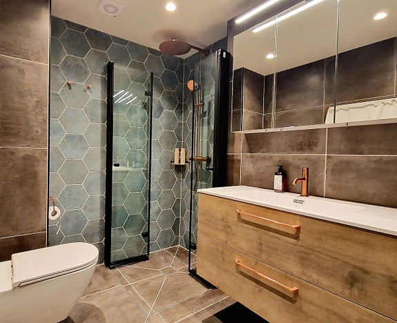 Flislagt bad med kombinert vaskemaskin/tørketrommel