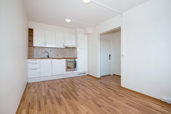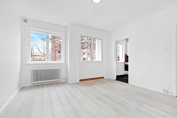 Entré, stue med utgang til balkong, separat kjøkkenløsning, bad.