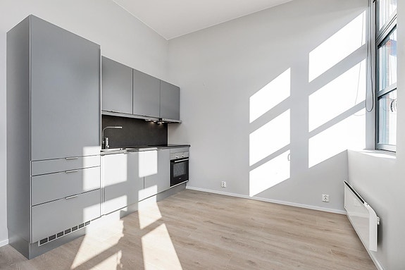 Umøblert. Kjøkkenhvitevarer, klesskap og bod medfølger.