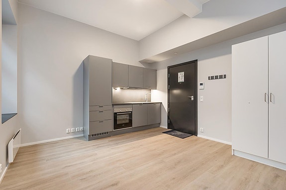 Entré med garderobeskap, stue med åpen kjøkkenløsning og bad.